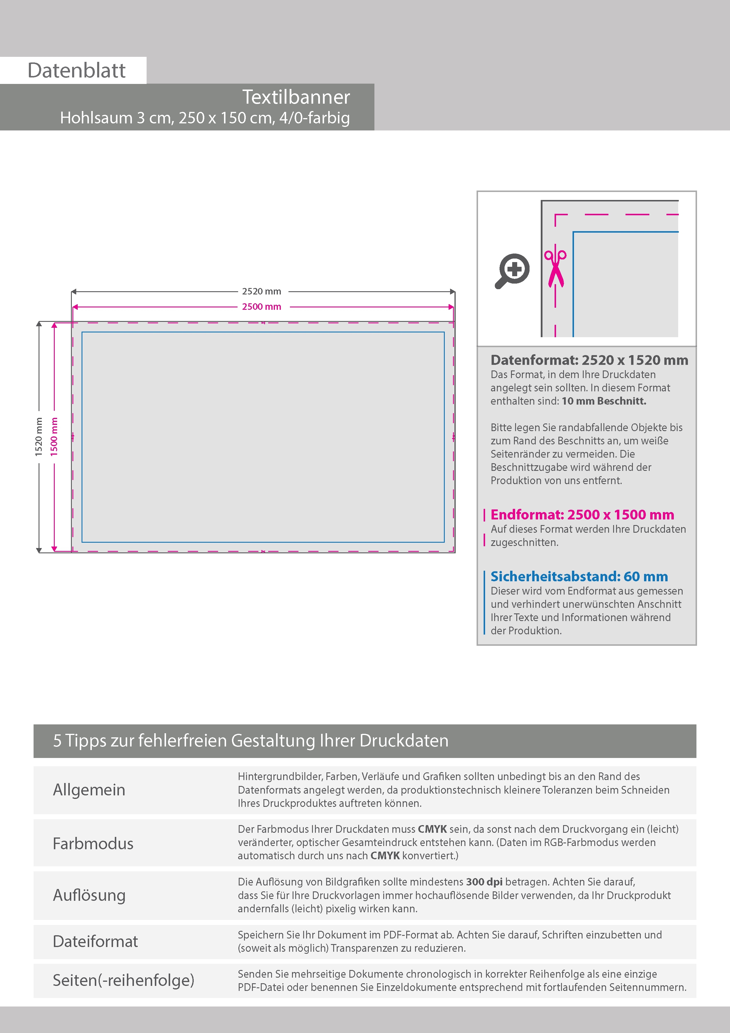 Hochwertige Stoff-Banner 250 x 150 cm, 4/0-farbig bedruckt, Hohlsaum links und rechts (Durchmesser Hohlsaum 3,0 cm)